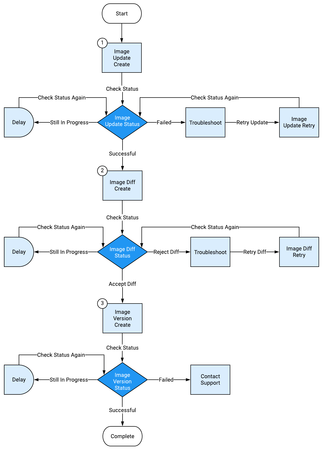要接受从差异分析生成的更改,请使用镜像版本创建端点,并使用镜像差异创建请求返回的差异 ID。镜像版本创建端点使用差异分析(如请求主体中的差异 ID 所指定),打包差异,并在完成后触发对您的舰队的推广。